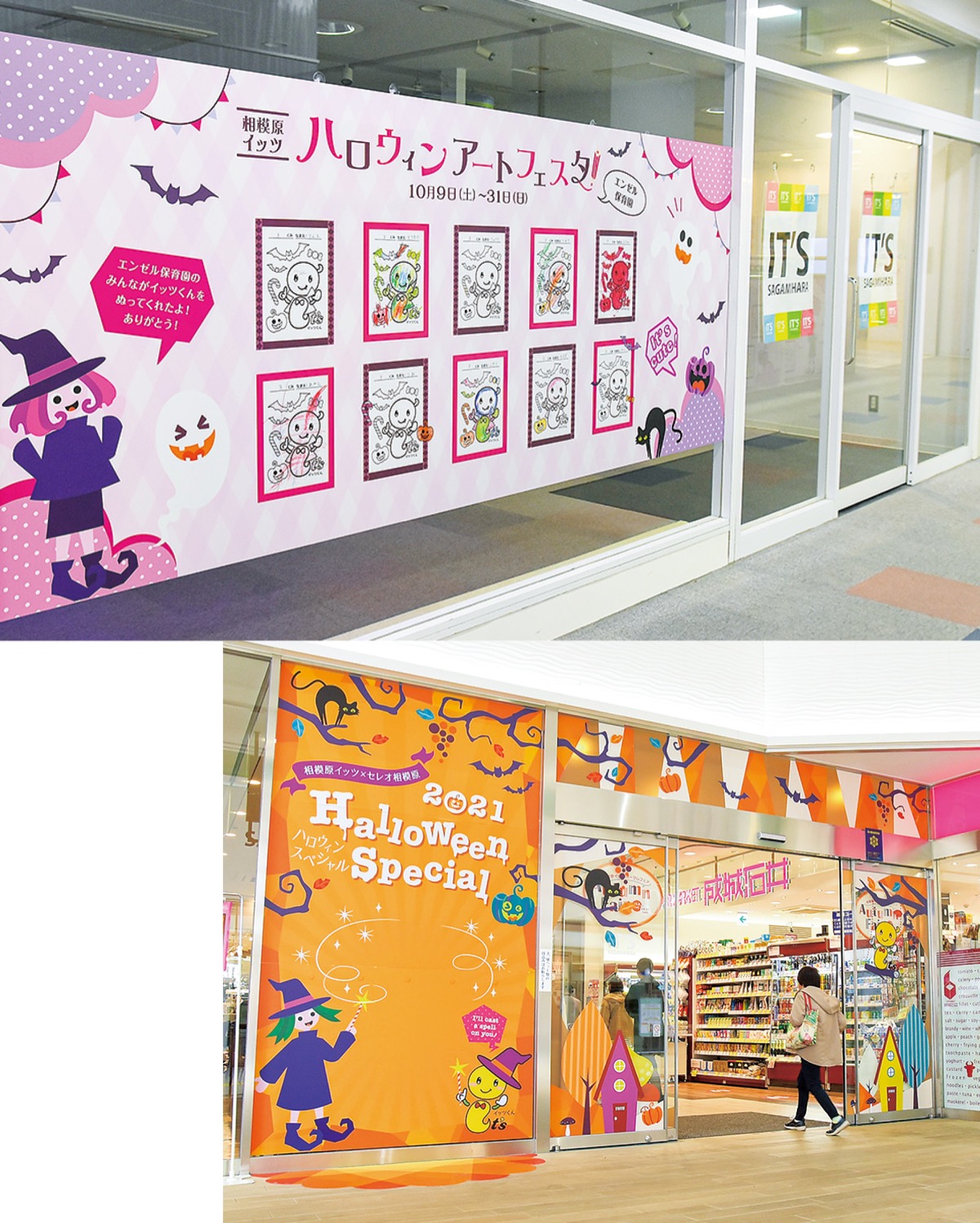 同館4・5階のガラス面には近隣保育園の園児たちが作成した塗り絵を展示。ハロウィン仕様のマスコットキャラクター「イッツくん」が、思い思いの色で彩られている。フェア最終日の31日にはセレオ相模原と合同で子ども限定のイベントを開催。受付で用紙とペンを受け取り、両施設に設置されたクイズに解答して提出すると、お菓子とパンプキンバスケットをプレゼント。午前10時30分から午後4時まで。なくなり次第終了。