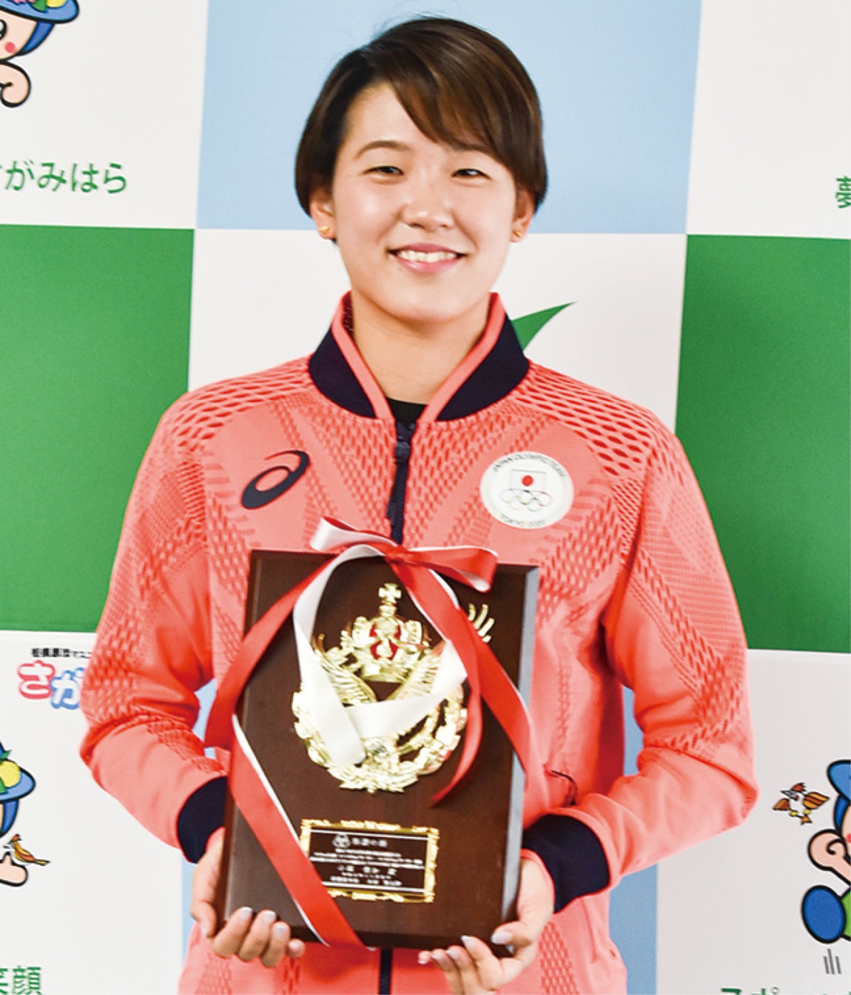 市役所を訪れた小堀選手は「目標としていた決勝には行けなかったが、ベスト記録を出せたのは良かった」と喜びながらも、「世界トップの泳ぎを間近で見て、自分の課題や足りない所も分かった。今後につながる経験だった。次は果たせなかった決勝をめざす」と意気込んだ。今回の活躍を称え、本村市長から称讃の楯が贈呈された。本村市長は「これからも日本の競泳をリードする選手として頑張って欲しい」とエールを送った。