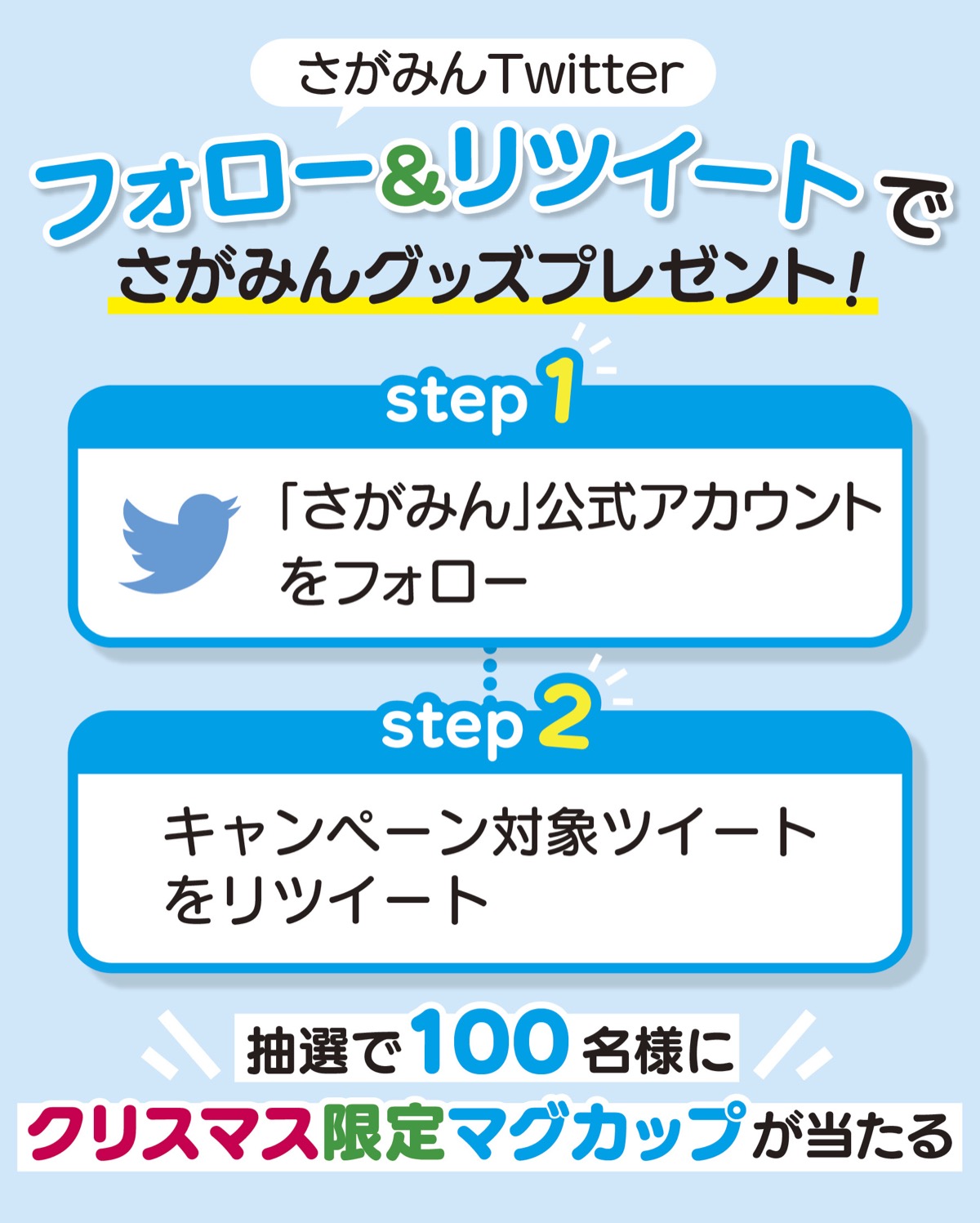 ツイッターで展開される同キャンペーンは、市の公式アカウント(@sagamin_love)が指定するキャンペーンツイートをリツイートしたフォロワーの中から、抽選で100人に「さがみん」のオリジナルマグカップ(クリスマス限定デザイン)をプレゼントする企画。