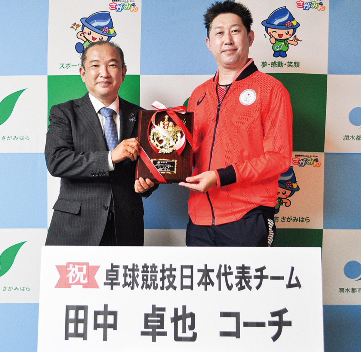市長表敬で称讃の楯が贈られたのを受けて田中コーチは、「伊藤選手がよく銅メダルを獲得してくれて、また多くの選手たちが入賞を果たしてくれた。選手たちにはありがとうと言いたい」と話し、感謝を示した。本村賢太郎市長は、「いま最も注目を集めるスポーツの一つ。パラ五輪での皆さんの活躍をこれからも願っており、支援していきたい」と激励した。