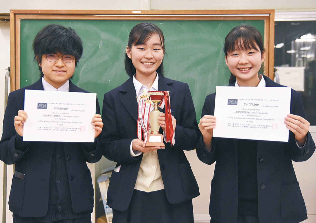 県立相模原高校の英語ディベート部2年の高橋沙綾(さや)さん、内山琴子(ことね)さん、齋藤あいりさんが10月に行われた「PDA神奈川県高校生即興型英語ディベート交流大会」で、優勝にあたる「チーム賞」に輝いた。