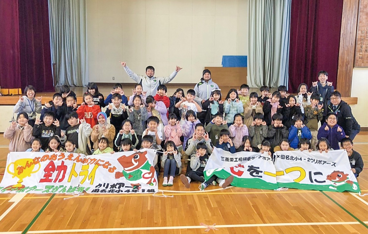 地元ラグビーチーム・三菱重工相模原ダイナボアーズを応援している田名北小学校(村井啓人校長)の4年生が横断幕を製作し、新リーグ開幕を控えたチームへ12月22日に贈呈式を行った。