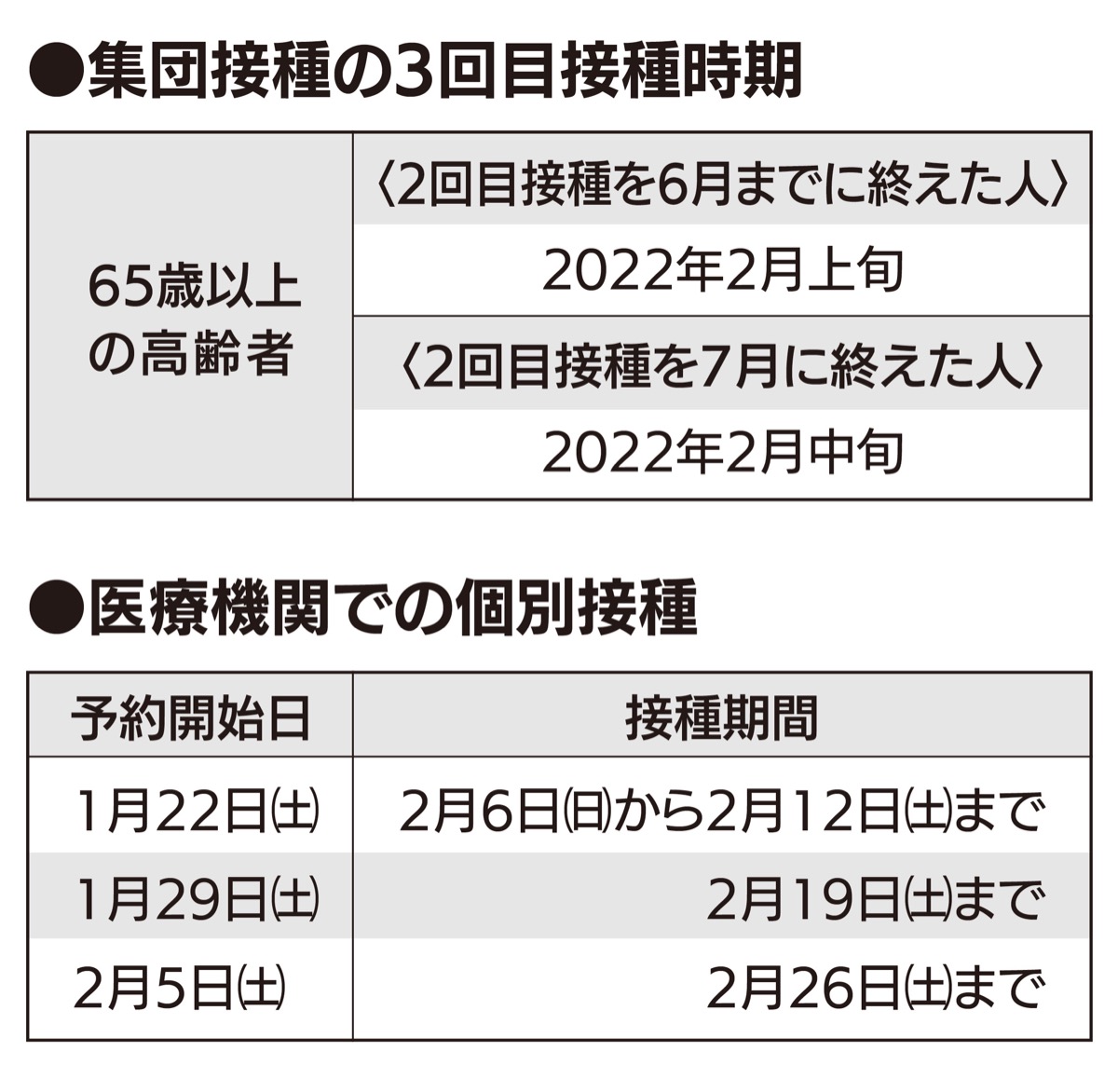 前倒し接種の対象は昨年7月までに2回目を終えた65歳以上の人。希望する際は郵送で届けられている「日時・会場指定方式 希望調査票」に電話番号を記入し、期限までに返信を。2月上旬から順次、日時と会場を指定した「決定通知」と接種券(クーポン券)がそれぞれ、接種日のおよそ3週間前を目安に郵送で届く。これにより医療機関での個別接種を検討していた人も集団接種に変更することで、より早く3回目接種が受けられる。
