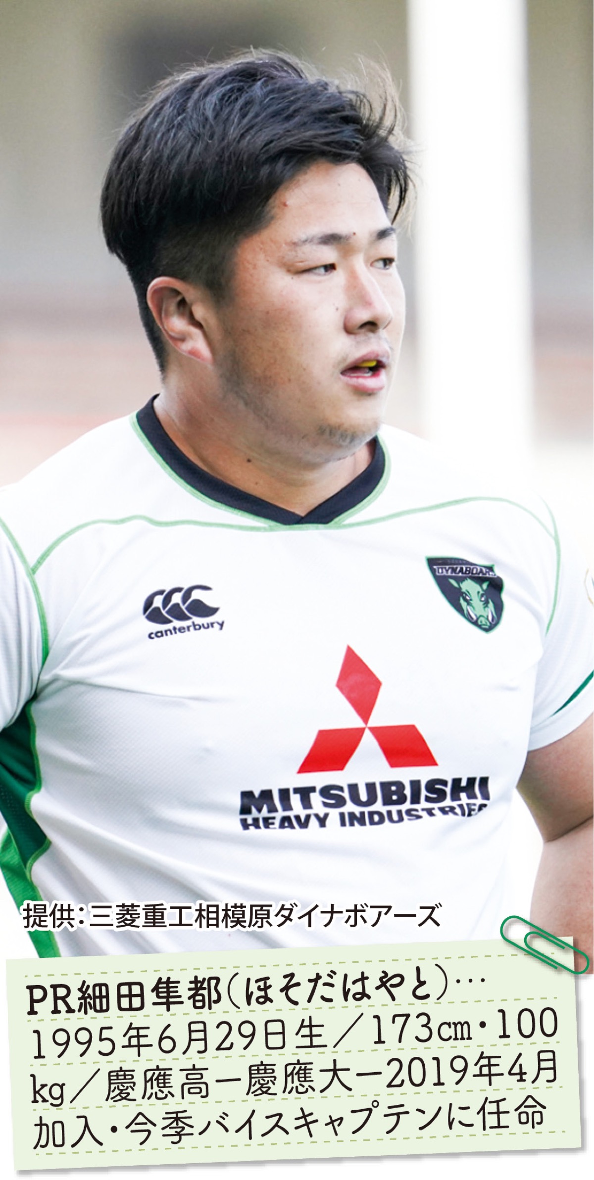 横浜市出身でラグビーを始めたのは小5の時。幼稚舎から慶應に通い、慶應伝統のタックルやフィジカルに定評がある。最前線で戦うPRはスクラムの柱。相手の力に対抗できるパワーと忍耐力が求められる。細田選手は小柄だが、タフで安定感のあるパフォーマンスを見せる。「スクラムからチームに勢いを与えられるよう、しっかり組んでいきたい。地元での試合は負けらない。皆さんの声援が力になります。応援よろしくお願いします」と語る若きリーダーの活躍に期待だ。