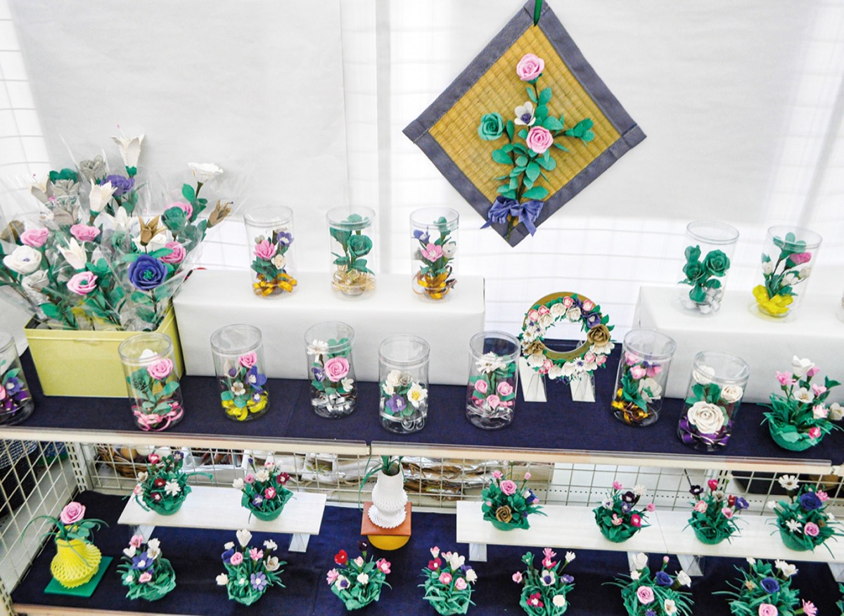 卵や果物の包装用紙で作られた色とりどりの花が店内を彩る。これらの作品は一つ500円で販売され、収益はすべて清新地区社会福祉協議会へ寄付がされる。