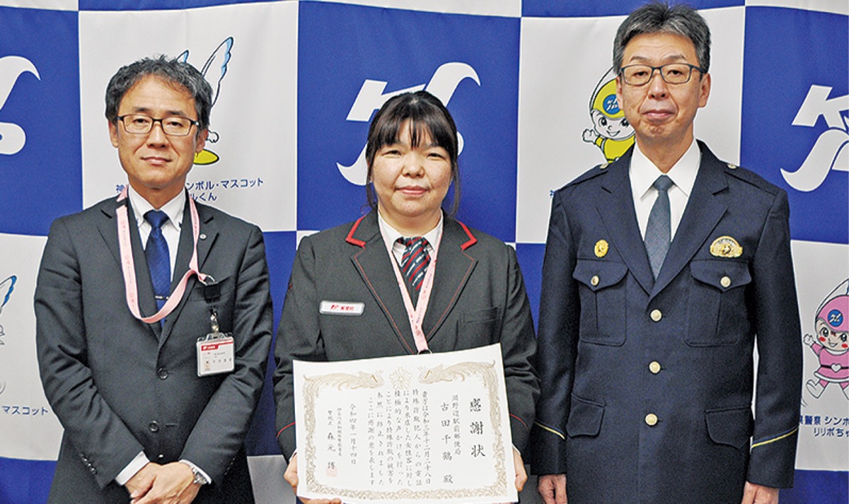 特殊詐欺の被害を未然に防いだとして相模原警察署(森元博署長)は1月14日、淵野辺駅前郵便局(今井英史局長)に勤務する古田千鶴さん(46)に対し、感謝状を贈呈した。