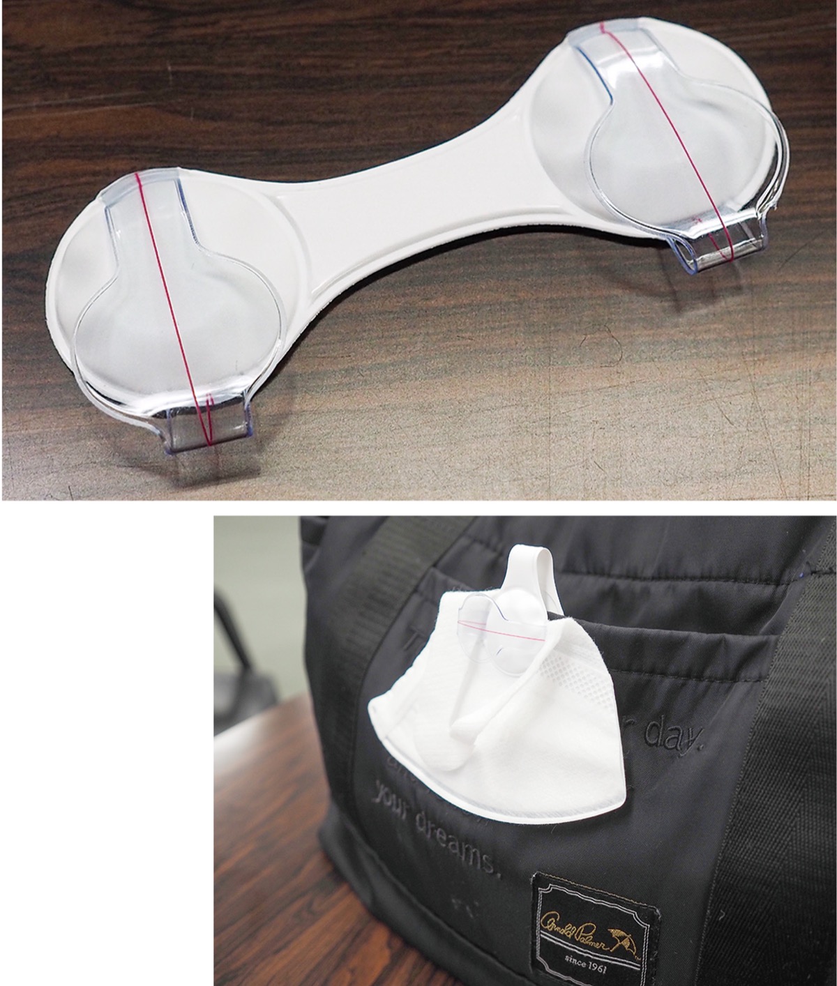 今回、嘉手納さんが発明した「てりっぱ」とは、長さ9センチほどのマグネットクリップ。内側に折りたたんだ使用中のマスクを、衣類の裾やバッグなどに手軽に保管できるようになっている。親指と人差し指を入れられるようにバンドをつけ、片手でも扱えるのが特徴だ。