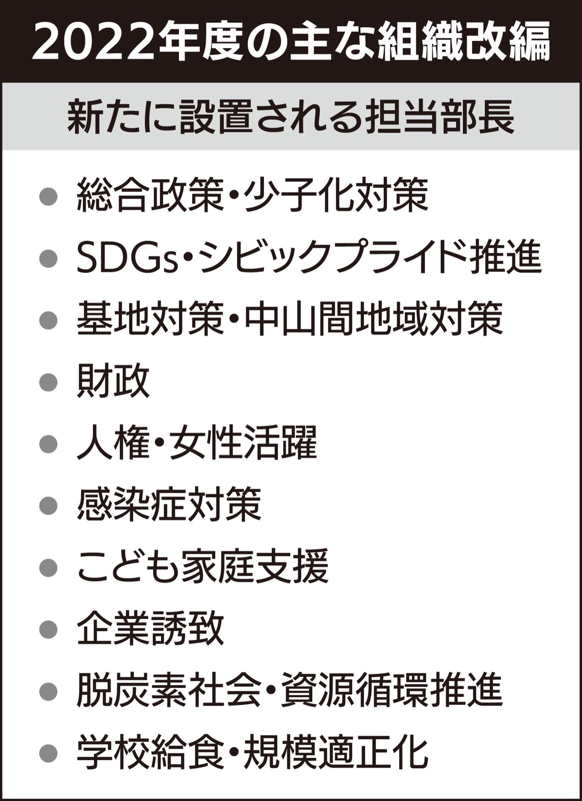 局相当は改編しない。部は今年度の23から14に統廃合し、市の重要施策の推進や市民ニーズなどへの対応、効率的な市政運営などを行うため、特定施策・課題を受け持つ担当部長を新たに10人設ける。中でも総合計画で市が重点的に取り組むテーマと定める「少子化」「雇用促進」「中山間地域」の各対策を推進するため、安心して妊娠・出産、子育てができる環境整備などに取り組む「総合政策・少子化対策」、移住・定住促進や観光振興などにより活性化を図り中山間地域のまちづくりを進める「基地対策・中山間地域対策」を局相当である市長公室に設置。同室には「SDGs・シビックプライド推進担当部長」も設ける。環境経済局には雇用促進などを見据えた企業誘致に取り組む「企業誘致担当部長」を置く。