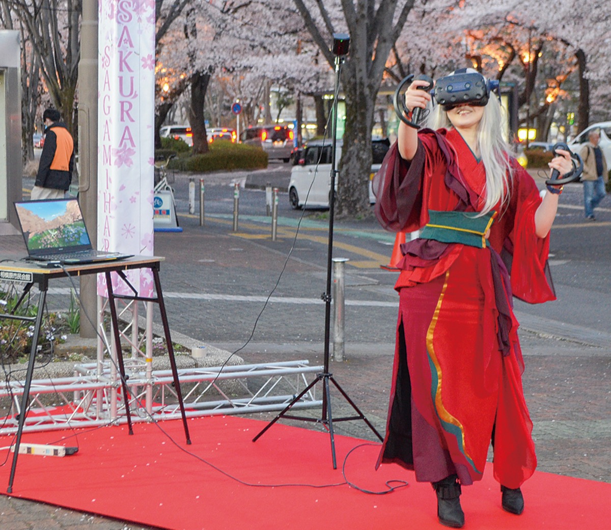 新型コロナウイルスの影響で実地開催が中止となった相模原市民桜まつりの代替イベント「SAKURA SAGAMIHARA」が3月25日から4月3日まで開催された。4月2日には、相模原市緑区出身のVRアーティスト・せきぐちあいみさん=人物風土記で紹介=が登場し、市民会館前の桜並木の下でVRアートを制作する様子が生配信された。