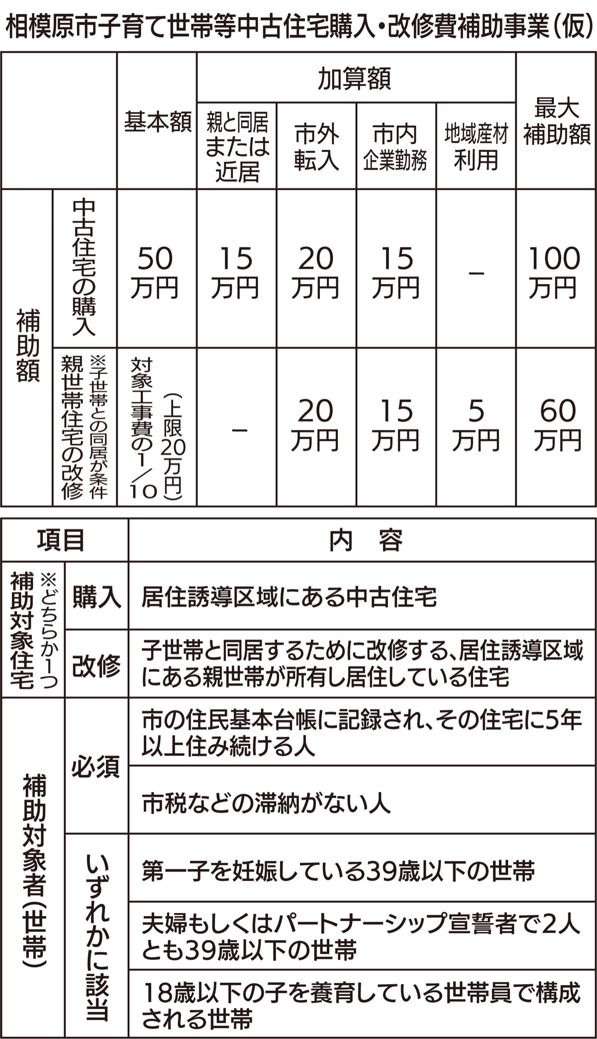 相模原市は、子育て・若年世帯などによる中古住宅の購入に最大100万円、親世帯住宅の改修に最大60万円を支援する独自の事業をスタートする。現在、制度の要項を固めており、6月1日(水)の開始を見込んでいる。