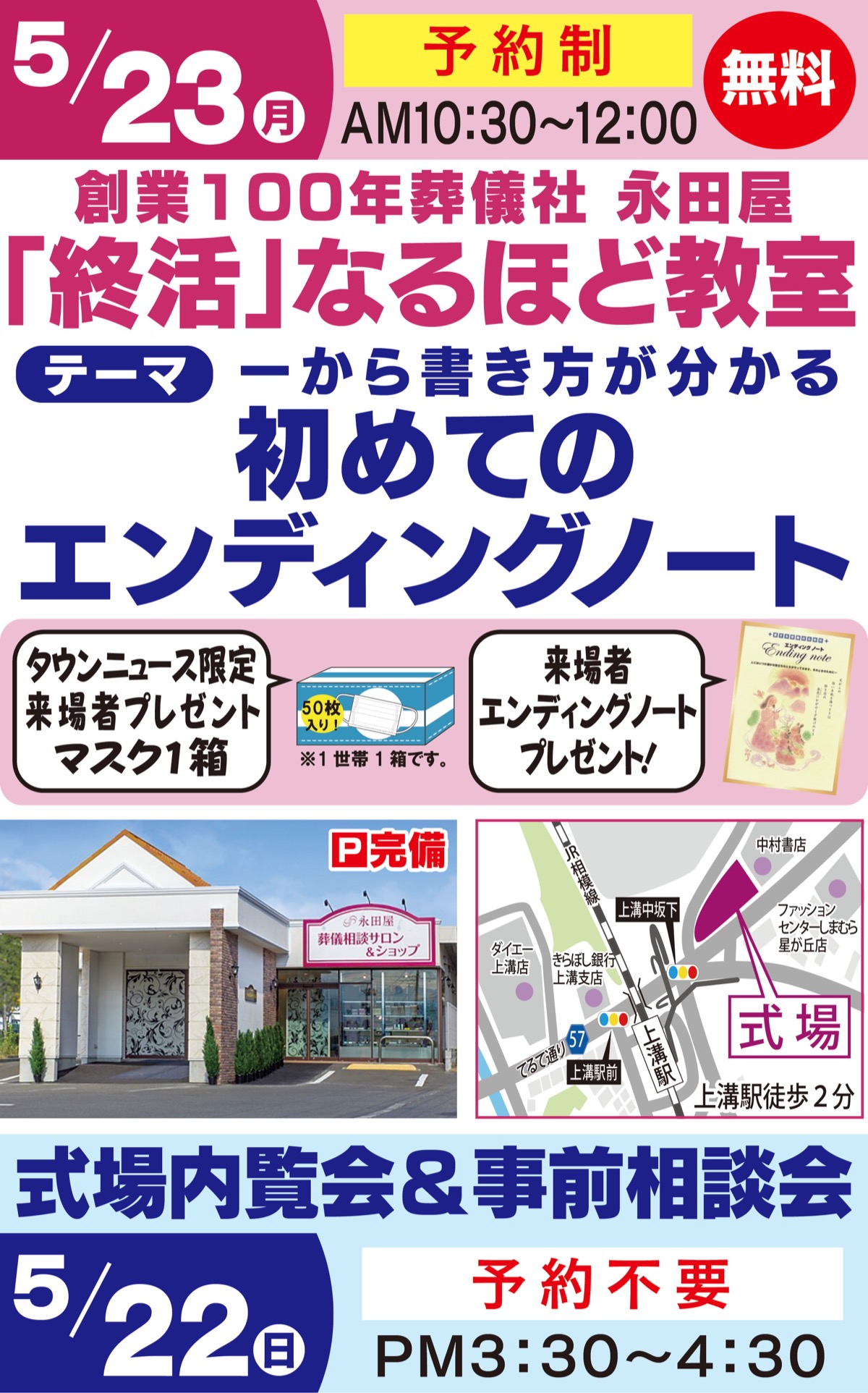 葬儀社・(株)永田屋の「終活」なるほど教室が5月23日(月)、小さな家族葬ハウスⓇ上溝で開かれる。参加無料。午前10時30分から正午。