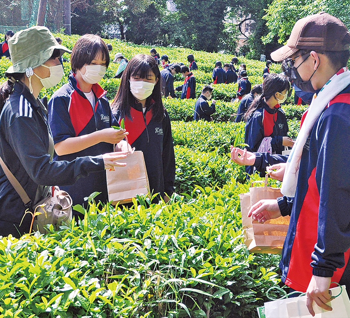 上溝中学校(及川秋人校長)で5月11日、伝統行事の茶摘みが行われた。