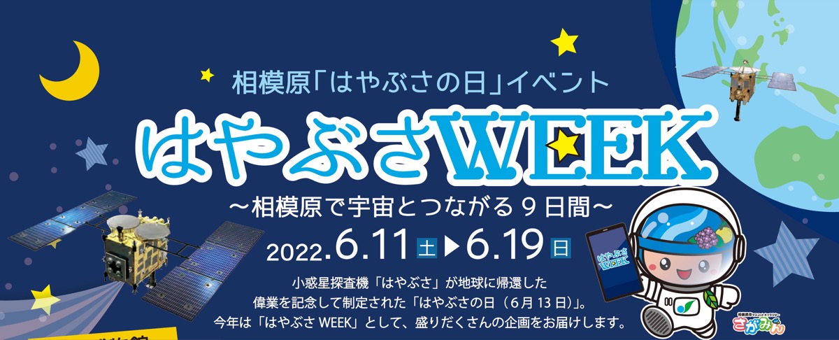 この他にも市立博物館やJR淵野辺駅、市内各所で「はやぶさWEEK」イベントが実施される。詳細は相模原市「はやぶさ2」特設ページ(https://www.city.sagamihara.kanagawa.jp/hayabusa2/)で確認できる。