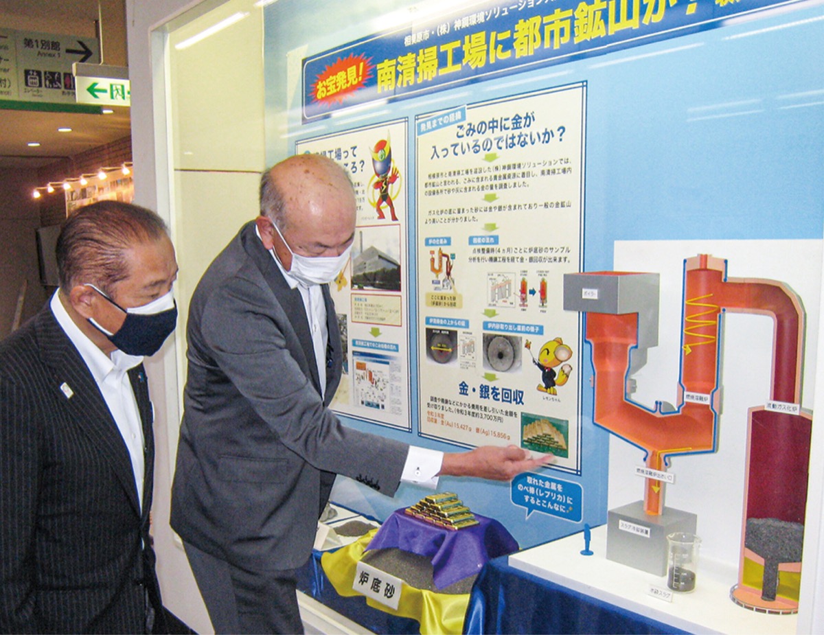 回収した実際の砂や金のレプリカのほか、ごみ分別の重要性、持続可能な社会の実現に向けた取り組みを啓発パネルなどで紹介。市の担当者は、「今回は焼却炉の砂から貴金属を回収したが、市民ができるだけごみを分別することで、より効率的な資源の回収ができる」と話している。