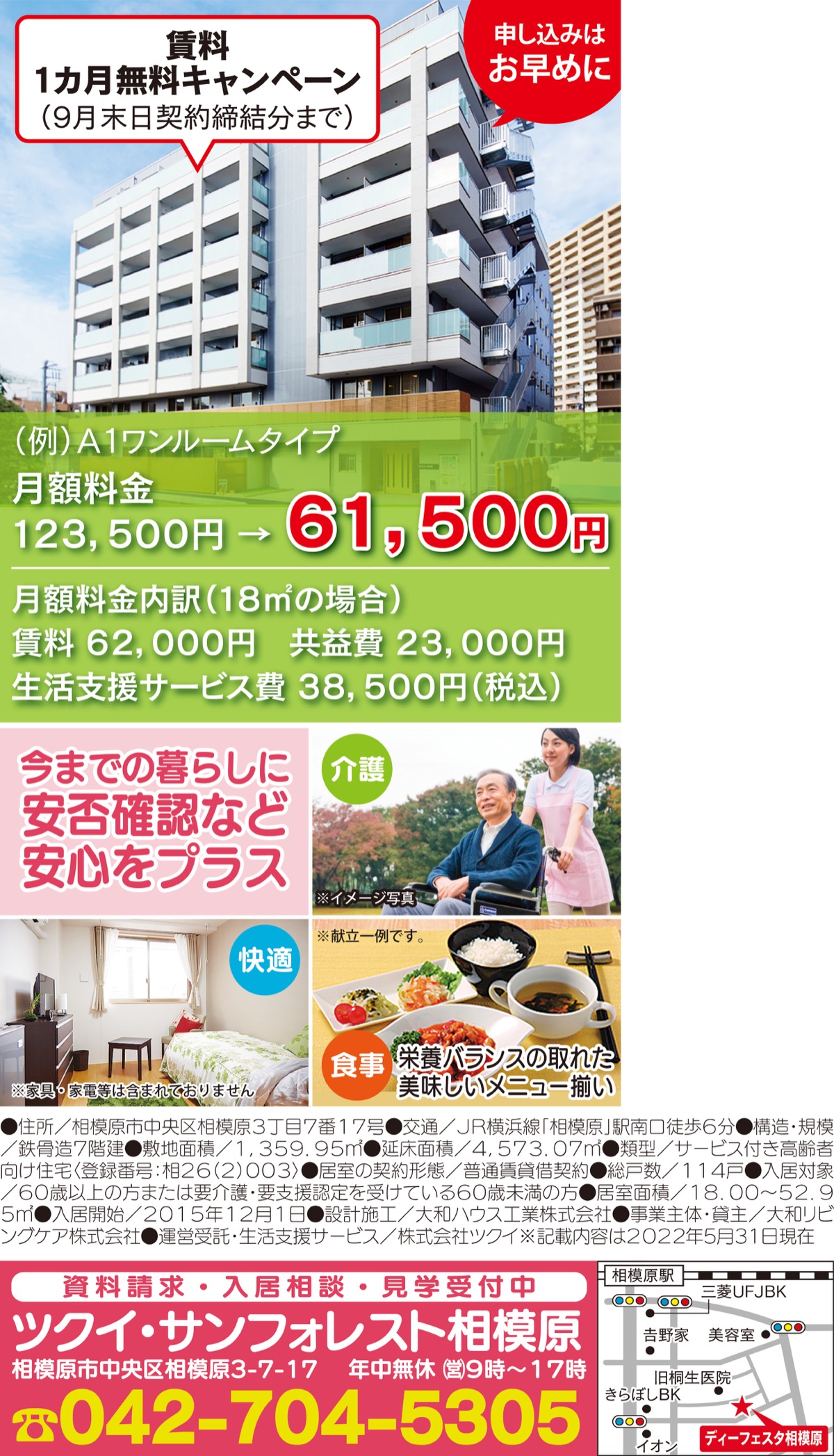 相模原駅南口徒歩6分のサービス付き高齢者向け住宅「ディーフェスタ相模原」は、9月末日までの契約で賃料が1カ月無料になるキャンペーンを実施している。好評につき、申し込みは早めに。