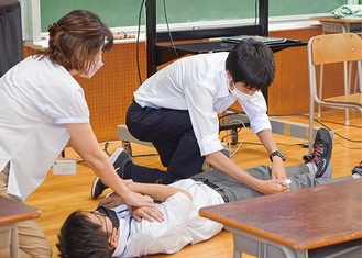 昨年、同校にエピペン保持者が入学したことを機に初めて講習会を開き、今回は2度目の実施となる。まず、座学で基礎知識を学んだ後、練習用の注射器を使って緊急時を想定したロールプレイを行った。「生徒を1人にしない」「担当を振り分ける」「注射器は垂直に」などの指導を受けながら、教員らは熱心に実習していた。伊藤一成校長は「いつでもどこでも、先生が適切な行動ができるよう身に付けていきたい」と話した。