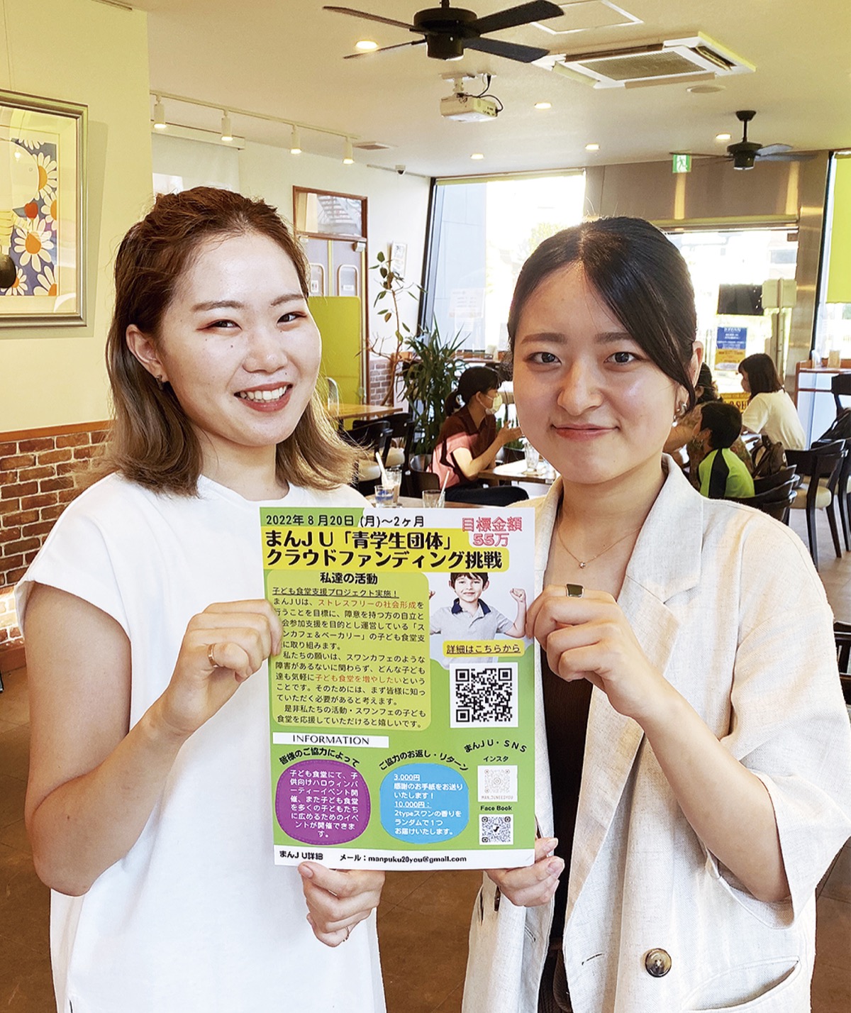 グループは梶田さんら13人の学生による「まんぷくNeedYou」(構成メンバーが20歳の学生中心であることなどから名づけられた)。梶田さんは障害者やハンディキャップについての授業を専攻しておりこの夏、実習の中でキャンパスの近くにあり、障害者が働く「スワンカフェ&ベーカリーさがまち店」(淵野辺/就労継続支援A型事業所)を訪れた。同店は障害者の自立と社会参加支援などを目的とし、店舗スタッフは35人で、20人が障害者。2020年10月に町田から移転オープンし21年11月から子ども食堂も運営している。