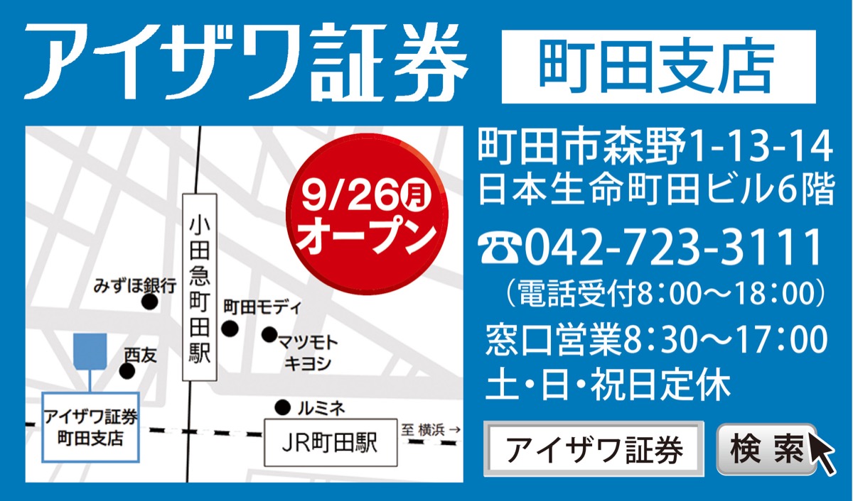 アイザワ証券の旧町田支店と相模原支店が統合し、9月26日(月)に新たな町田支店がオープンする。新店は小田急線町田駅から徒歩3分、JR横浜線町田駅から徒歩6分の好立地。