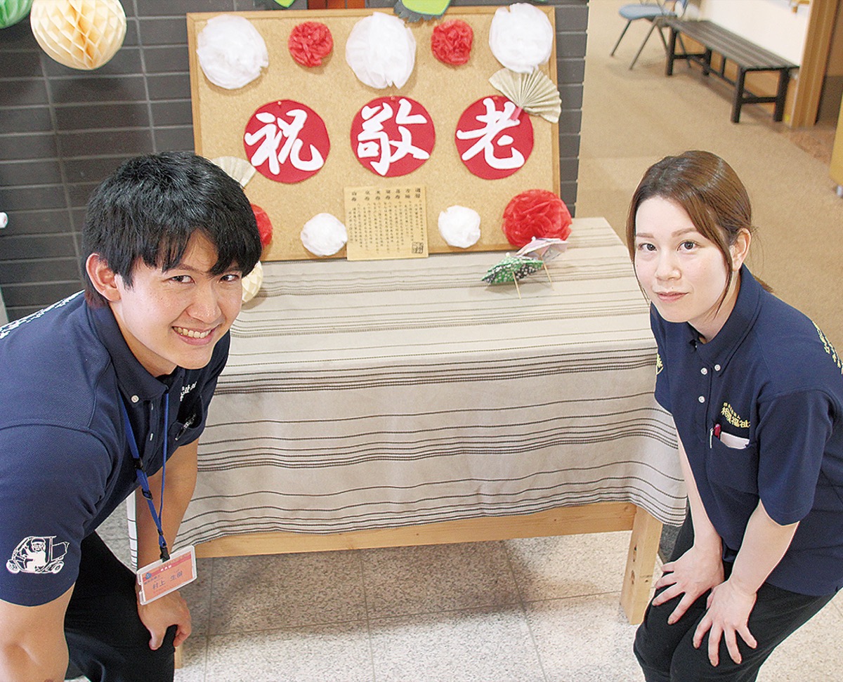 日々の生活を支えているのが介護職員の玄間由貴さん(33)と機能訓練士の村上生樹さん(27)。玄間さんは「元気に明るく。利用者さん一人一人の個性を理解して声をかけることを心がけています」、村上さんは「利用者さんを敬い、尊重しながらも、堅苦しくなりすぎないよう気を付けています」と話す。