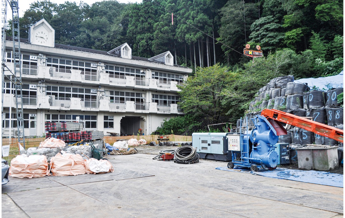 県は、土砂崩れの復旧工事を19年11月から開始。現在は新たな土砂被害を防ぐために土のう袋が置かれている。工事を請け負っているイビデングリーンテックは「今年の12月までには土砂崩れの工事が終了する」と話す。県の工事が終わった後、来年1月から8月にかけて市による校庭の復旧工事が行われる見込み。市学校施設課は、「市内で災害により校舎、校庭が使えなくなったケースは今回が初めて」と話し、「自然が相手ということもあり、工事が延びてしまうことも考えられる。子どもたちが戻れる環境をできるだけ早く整備していきたい」と話した。