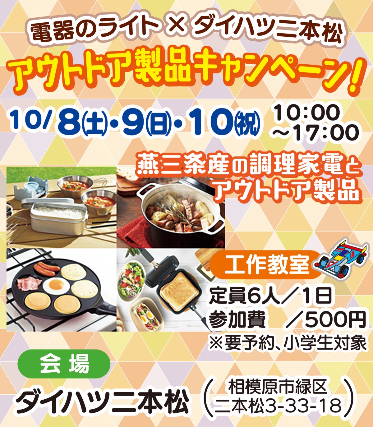 ダイハツ二本松を会場に、ライトの佐々木亮一社長自ら現地で買い付けた燕三条産の調理家電ととっておきのアウトドア製品がずらり。また、電気のプロが教える「工作教室」も開催。コイルを巻いて電池で動く車を作る。こちらは小学生対象、参加費500円で1日定員6人、要予約。受付は10月1日から。予約はライト本店【電話】042・755・5555。