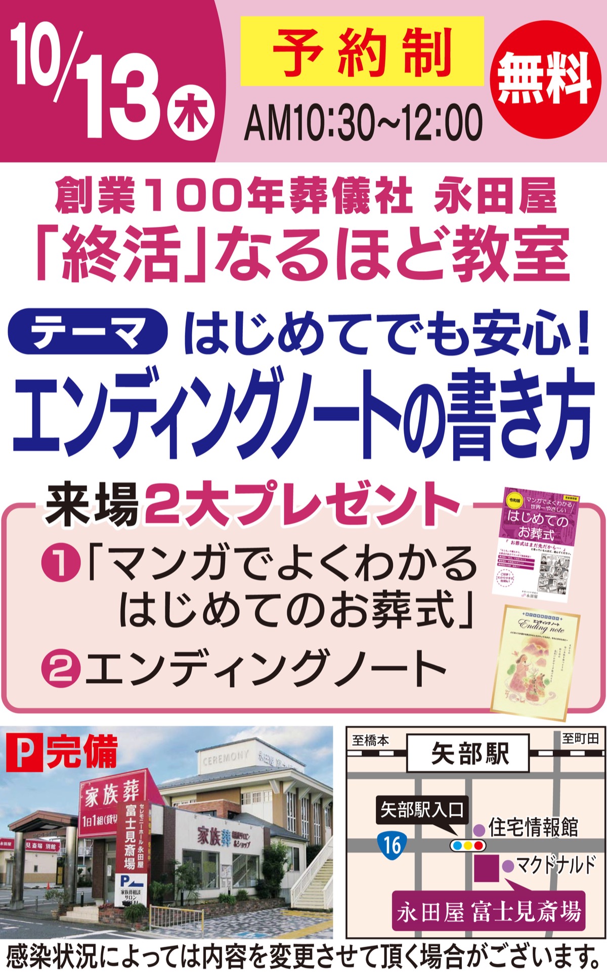 葬儀社・(株)永田屋の「終活」なるほど教室が10月13日(木)、富士見斎場で開かれる。参加無料。午前10時30分から正午。