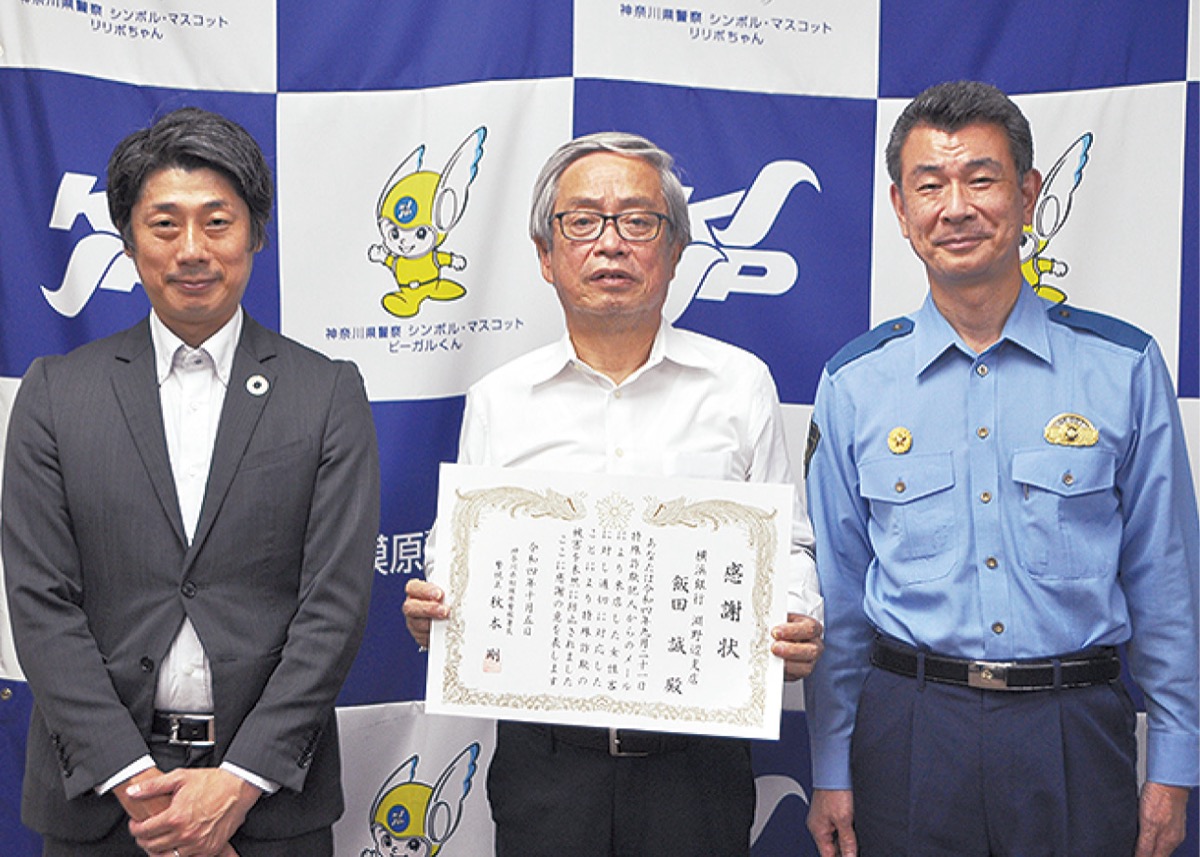 相模原警察署(秋本剛署長)は10月5日、不正に口座を開設させようとする詐欺を阻止したとして、横浜銀行渕野辺支店(山口昌明支店長)に勤務する飯田誠さんに感謝状を贈呈した。