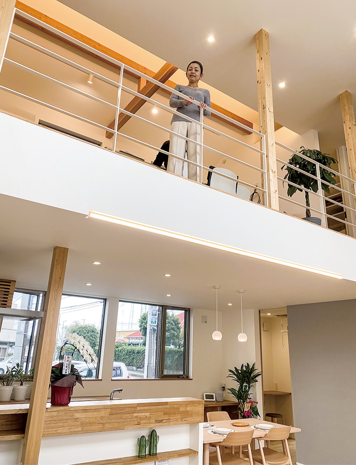 念願というモデルハウスには同社の強みとする「自由設計」の魅力が詰まっている。まずは大きな吹き抜け。1階リビングは2階天井まで連続した空間となっており、広い窓からたっぷりと光が入りとても開放的。「家族が自然に集まる場所を目指しました」。玄関から靴入れ、洗面、ランドリールームへと一直線につながった動線、質・量とも充実した収納については「女性設計士」による貢献が大きい。「大袈裟な家でなく実際に暮らすことをイメージした、等身大のモデルハウスです」。W断熱、子どもの成長に合わせたフリースペースなど他にも見どころは満載。「このような『愉しめる』住宅は自由設計ならでは。モデルハウスはその一例です。我々が施主の方のイメージに合わせて作り上げていきます」と梅村社長。