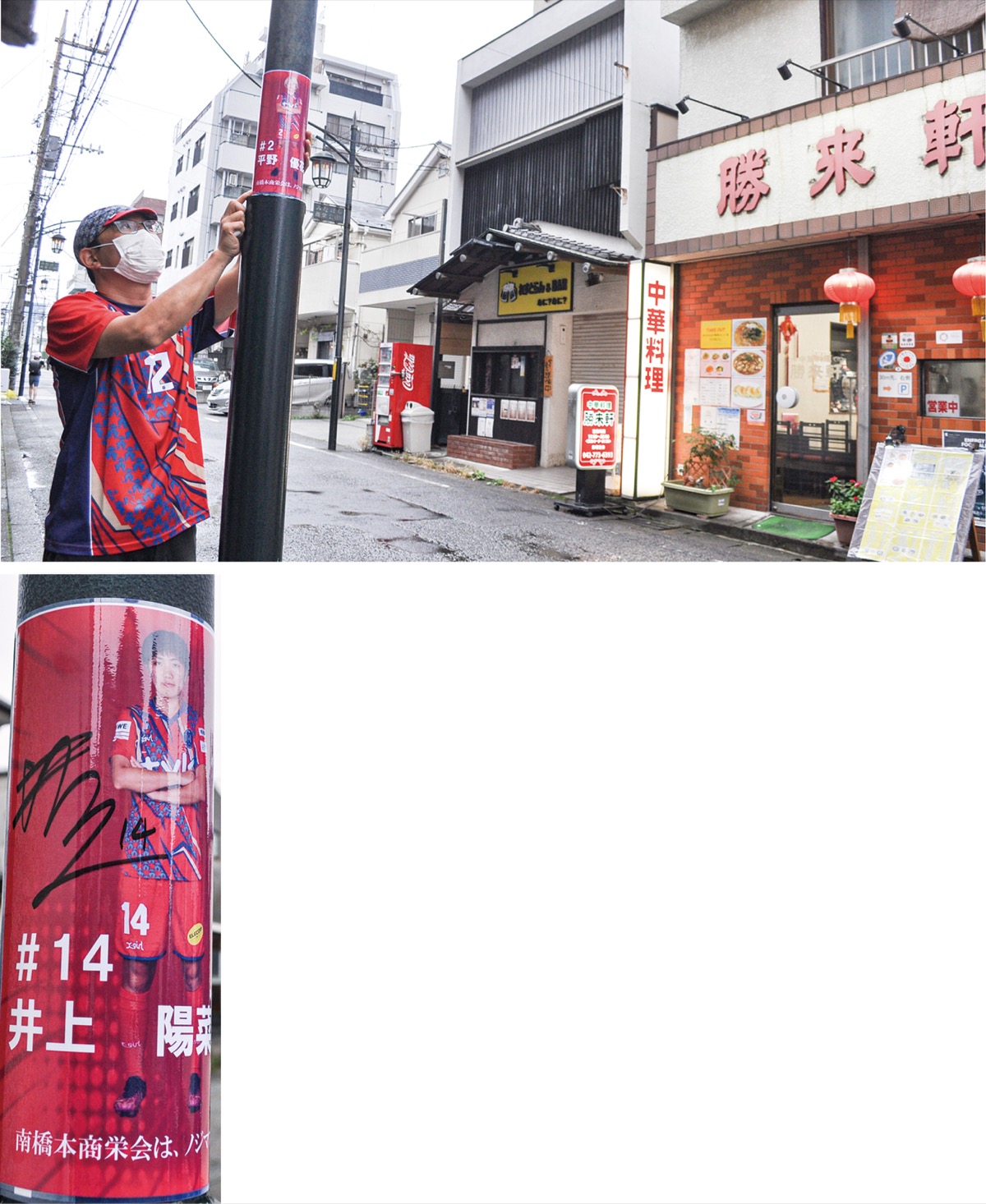 ポスターは27人の全選手分あり、それぞれ商店街の街路灯に巻かれた。10月17日、チームスタッフが訪れ、商店会の森山勝徳さん(勝来軒)と一緒にポスターを貼って歩いた。