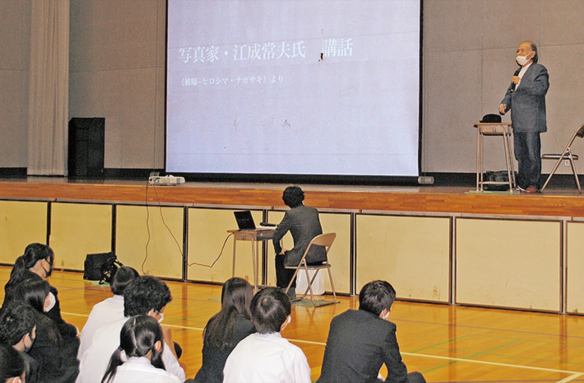 修学旅行で広島などを訪れる相模田名高校(中央区田名・都丸利幸校長)の2年生が10月17日、原爆の悲惨さなどを伝える写真を撮り続ける田名在住の写真家・江成常夫氏を招いて、事前学習を実施した。生徒らは写真の裏側の事実に真剣に耳を傾けた。