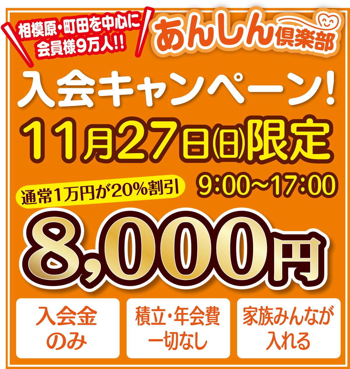 相模原・町田を中心に9万人の会員を誇るお得な会員制度「あんしん倶楽部」の入会キャンペーンも当日限定で開催。通常は入会金1万円のところ、20%割引の8千円で入会できる。同社の式場使用料が50%割引、葬儀基本コースが20%割引になるほか、地域の提携協力店772店舗(22年11 月現在)の割引やサービスを受けることができるなどの特典が満載。