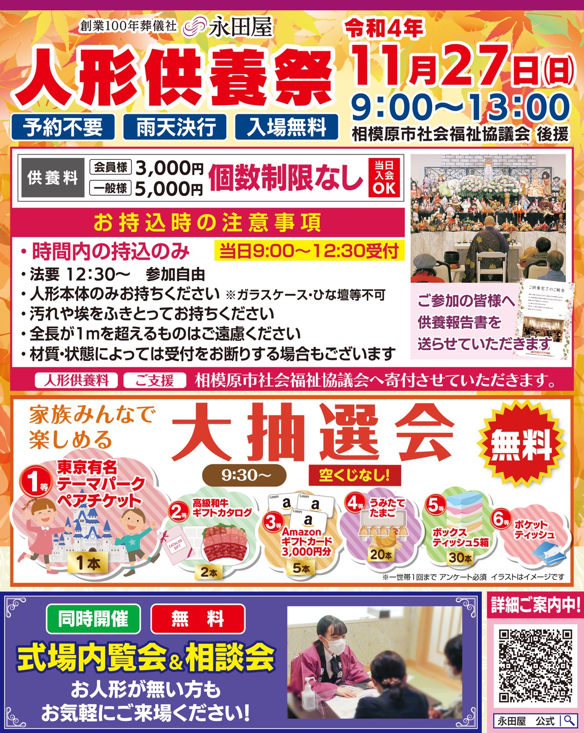 創業100年葬儀社の永田屋は11月27日(日)、午前9時から午後1時まで、「人形供養祭」を小さな家族葬ハウス®上溝で開催する。予約不要、入場無料、雨天決行。