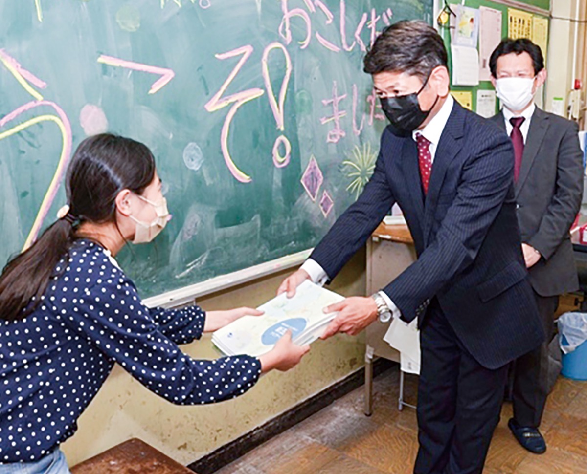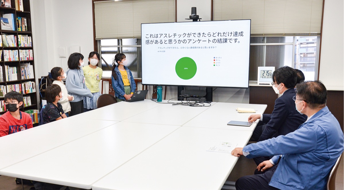 再設置の資金を集めるため、先月から学区にある企業や団体を回り寄付を呼び掛けている資金集めチーム。当日は、チームの15人が同社を訪れ、小松源専務取締役、山本孝次常務取締役、小石川哲也総務部長を前にプレゼンテーションした。児童はアスレチックへの思いや、復活プロジェクトの詳細をタブレットを使って力説。チームでは資金集めの方法として、募金とクラウドファンディングの2つでどちらが良いか話し合った結果、「募金は相手の顔が見える」「地域のみんなと新しいアスレチックの完成を喜びたい」と募金を選んだ経緯を説明。さらに、「アスレチックを完成させてほしいというみんなの思いを5年生が背負って頑張っている」と伝えると、全員で「協力をお願いします」と訴えた。