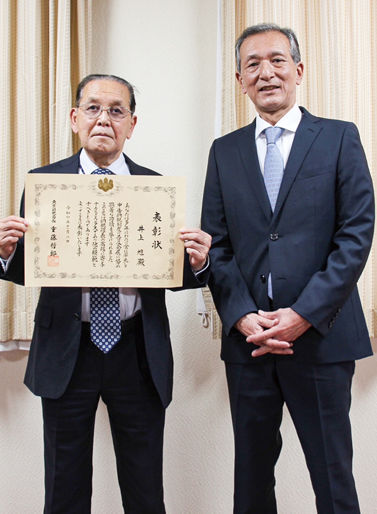 相模原税務署を11月16日に訪れた井上氏は齋藤英男署長から祝辞を受け、「非常に名誉なことで驚いている。税務署の方々がいろいろと骨を折ってくださって、ここに到達できた」と話した。齋藤署長は、「関係民間団体のご協力がなくては、円滑な税務行政は行えない。井上会長の長年のご功績に深く感謝を申し上げる」と述べた。