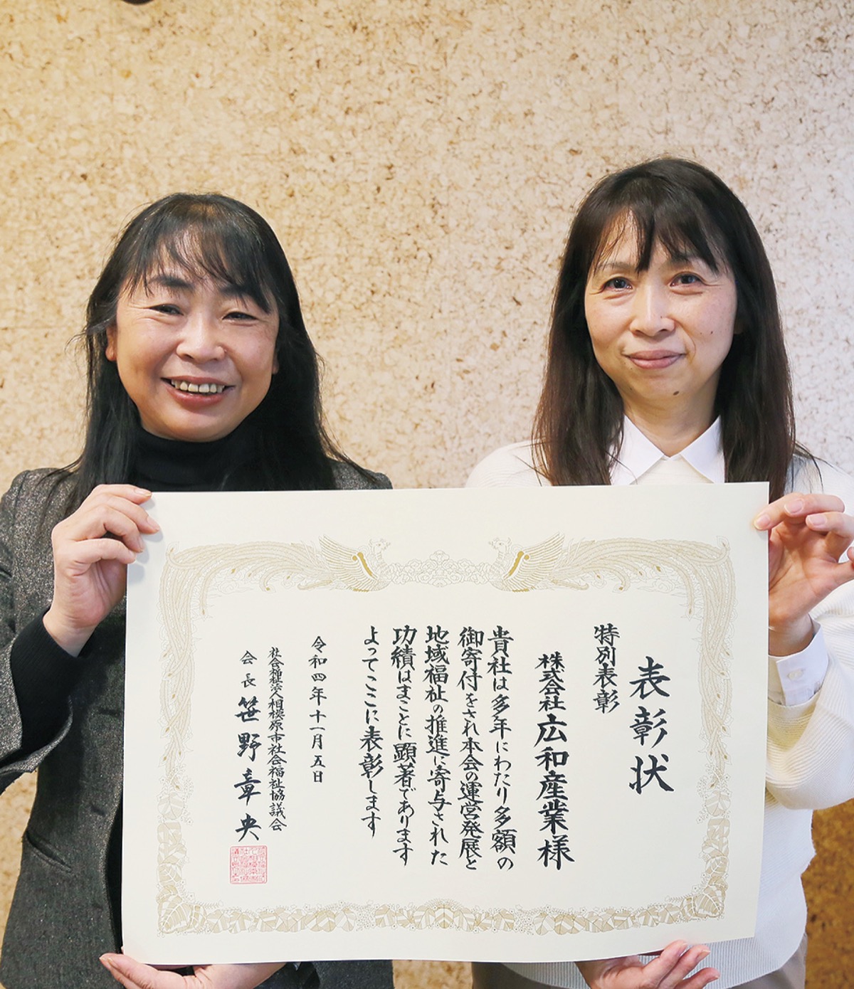 相模原市社会福祉協議会(社協)はこのほど、同協議会の運営や発展に大きく寄与したとして広和産業(小山)に特別表彰を贈った。