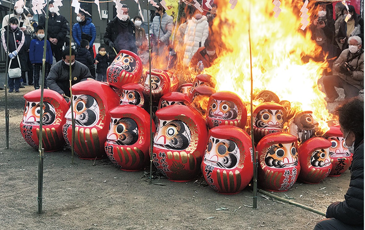 溝の縁起だるまを求めに遠方より多くの人が訪れる人気イベントで、盛大に行われるだるま供養のお焚き上げには、近隣より300を超えるだるまが集められる。