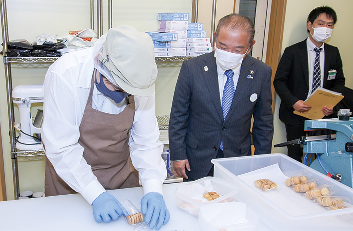当日は本村市長はじめ相模原市の職員が店舗、調理場を見てまわり、パンづくりを手伝ったり、パンを入れる箱を組み立てる利用者に声をかけるなどしていた。店舗を運営するリープス(富士見)の大本哲也社長は、「施設を見て明るい現場などに関心を持っていただいたようで良かった」と喜び、「より利用者のためになる施設であるよう、しっかり運営していきたい」と話した。