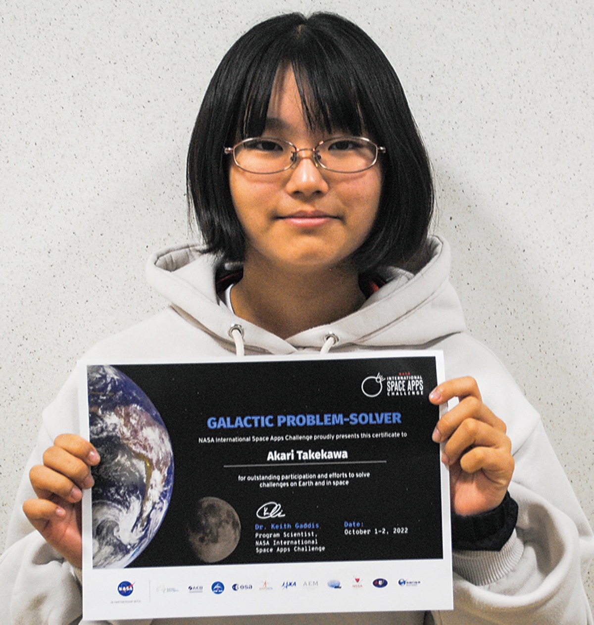 NASA(米国航空宇宙局)が主催して昨年12月8日に行われた、アプリケーション(アプリ)開発を競う米国のハッカソン(技術者らがソフトウェアやアプリケーションを短時間に開発し、成果を競うイベント)「NASA Space Apps Challenge2022」で、上溝中学校1年の竹川明里さんが所属する宇宙の天気に着目したチームが、世界10選の「グローバル・チャンピオン」の1つに輝いた。