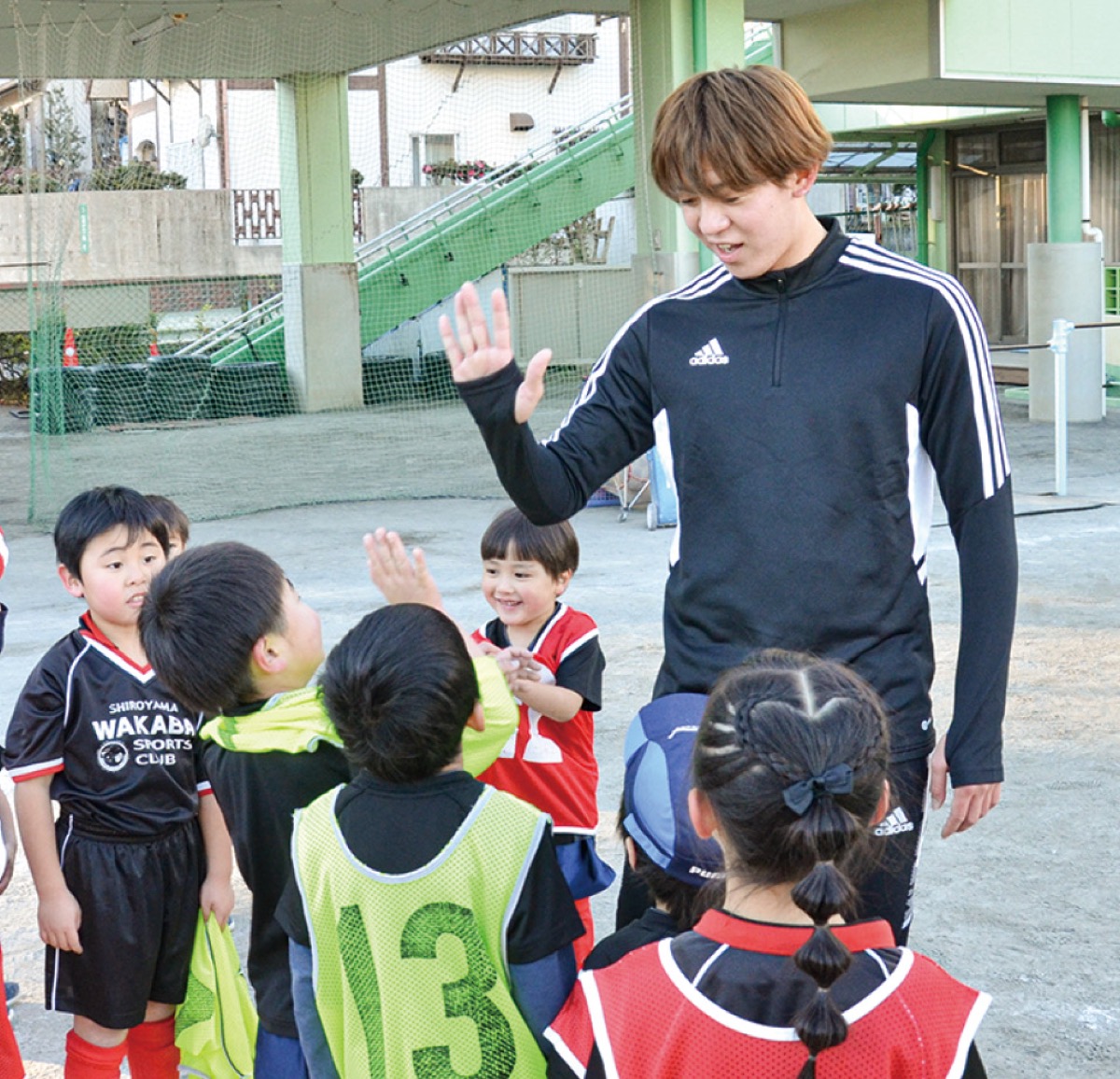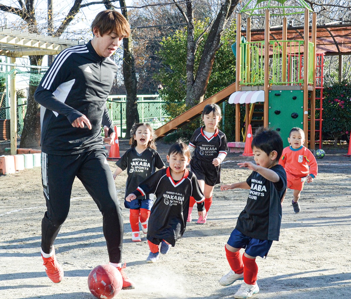 緑区二本松出身でサッカーJ1のガンバ大阪に所属する山本理仁選手が12月20日、城山わかば幼稚園(緑区若葉台)を訪れ、園児とサッカーで交流を深めた。山本選手は幼い頃、同園に通い、城山わかばフットボールクラブに卒園まで所属していた。園庭を訪れたのは卒園以来という山本選手は「あの頃はコートが広く感じたけど、今は狭くなった感じ」と笑う。