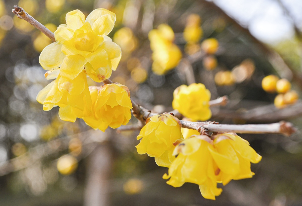 「蝋梅」の名は、蝋細工のように見える花の姿が由来。土壌を選ばず日陰でもよく育つ。同公園によれば「天候にもよるが、見ごろは例年1月下旬ごろまで」。