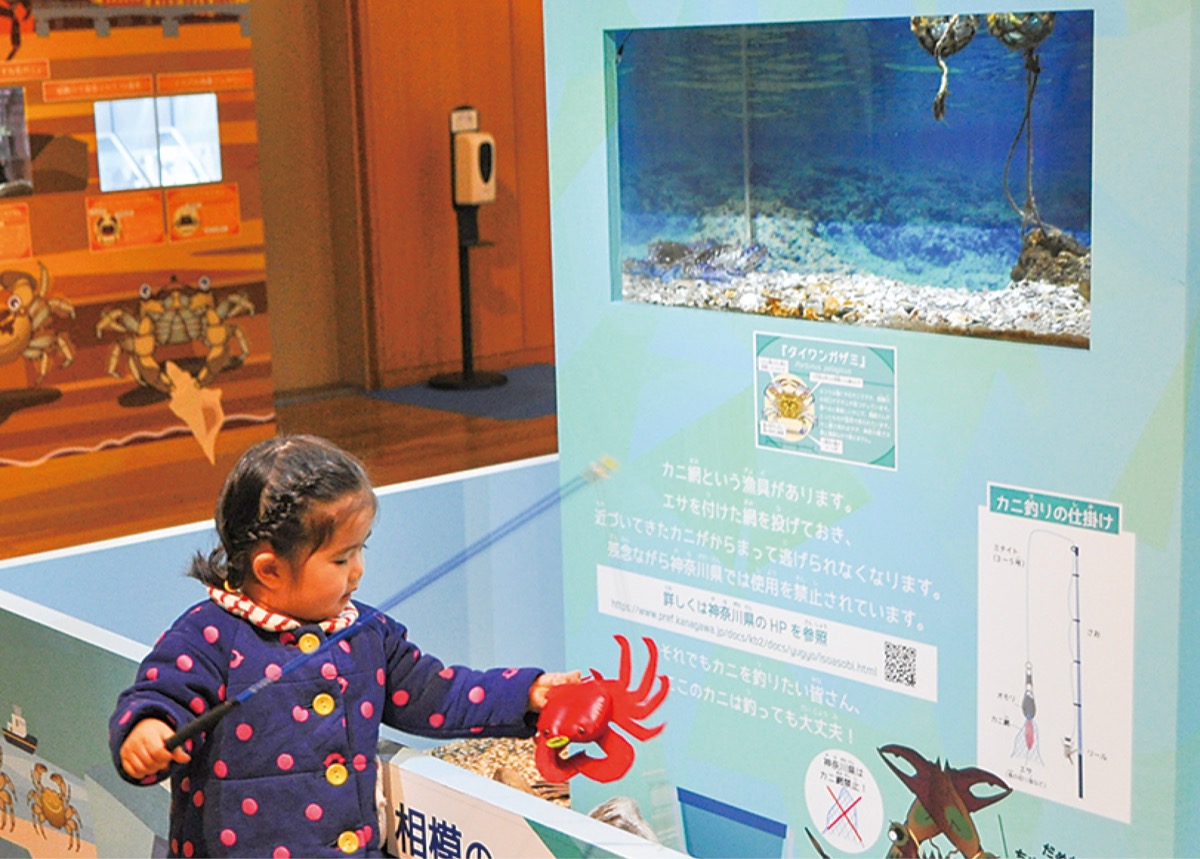 相模湾に生息する世界最大級のカニであるタカアシガニや、沖縄のマングローブ林でよく見られ相模川では2002年に初めて記録されたフタバカクガニ、強靭なハサミが特徴のアミメノコギリガザミなど、相模川に関連するカニを一挙に紹介。相模川や相模湾の、カニの生息環境としての重要性を伝える内容となっている。また、現在は相模川から姿を消したカニや、南方から参入してきた種も展示。カニをめぐる相模川の生態系について詳しく学ぶことができる。