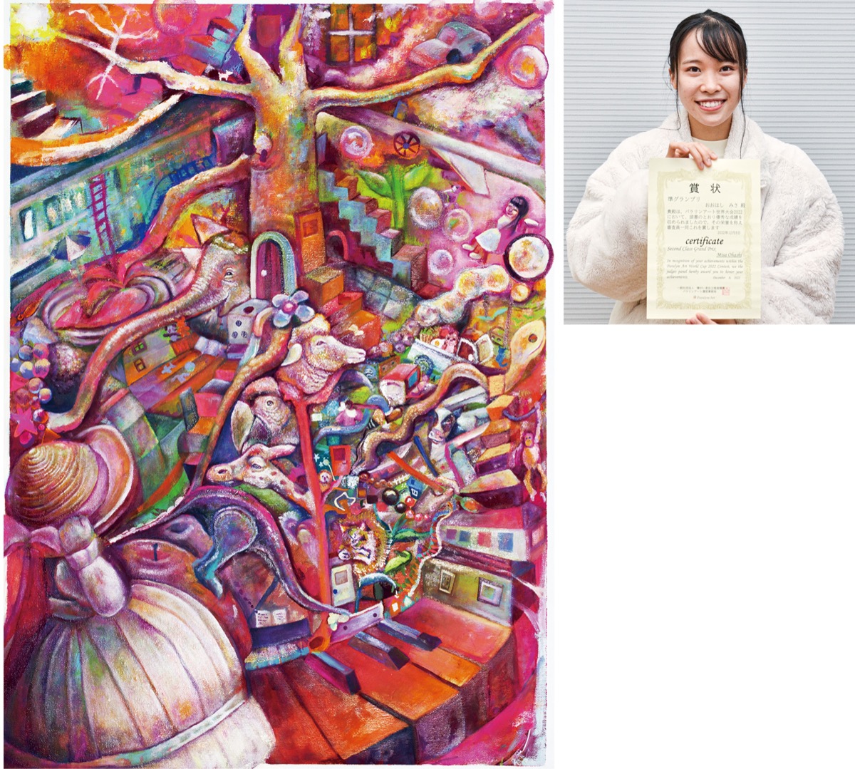 絵の中には帽子を風に飛ばされないように押さえる女の子、動物や果物、乗り物などを細かく敷き詰めた。どれにもストーリーがあり、「例えば階段の上にあるシャボン玉は車椅子が段差など関係なく自由に行き来できる様子を描いた。未来への不安や大変さはあるけど、面白さもある。そしてよく見ると、いろいろなものがつながっていて、そんな思いを 1つにした」という。「昨年もエントリーしたけど、うまく描けなくて納得できないまま出品してしまい、後悔があった。それなので、今回の準グランプリはうれしい」と喜ぶ。続けて、「絵でグランプリを取ったことがないので、来年こそはグランプリを取りたい」と新しい目標への挑戦を誓う。