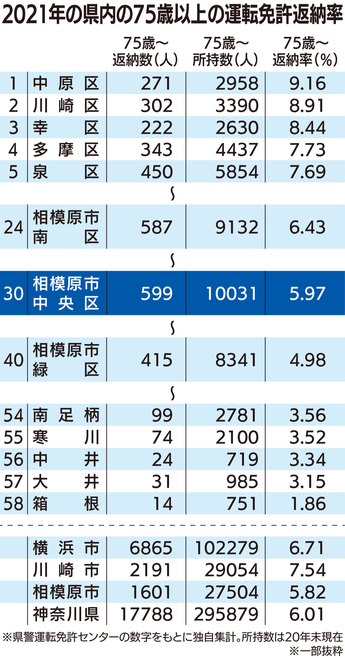 県内では、最も返納率が高いのは中原区(9・16%)、川崎区(8・91