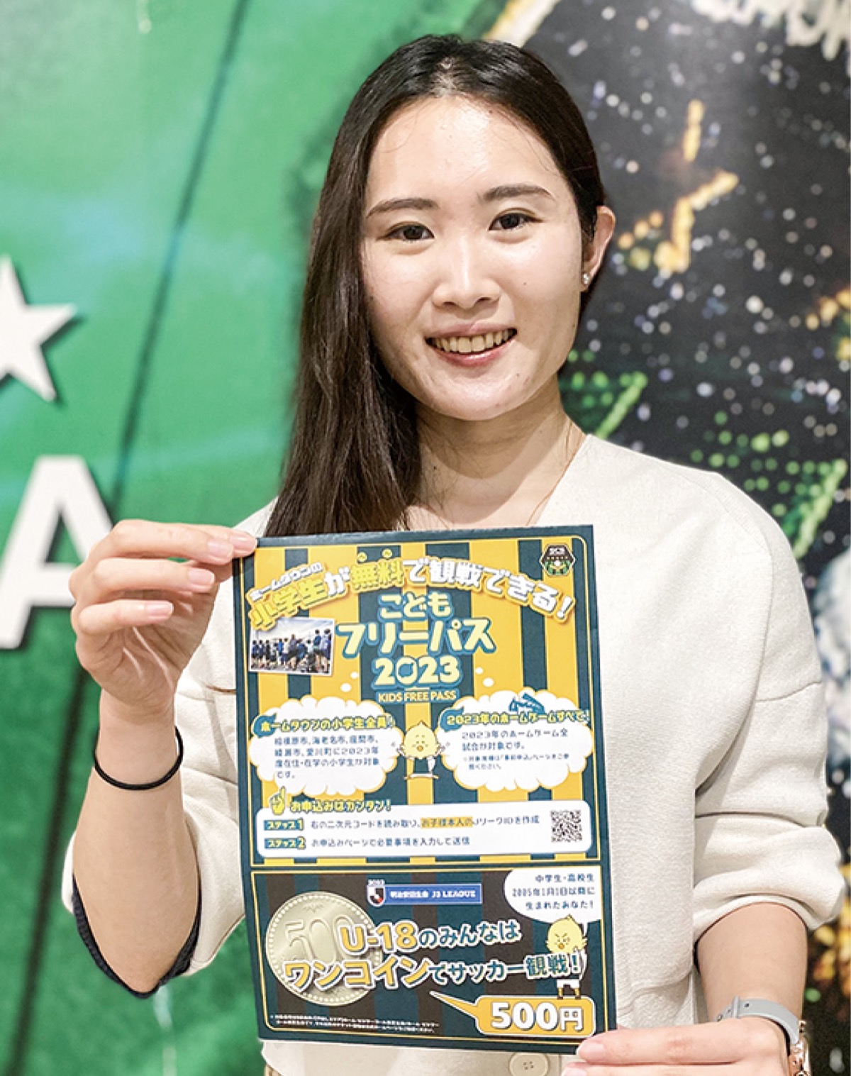 対象席種はホームゴール裏芝生。アップグレードサービスで希望の席種での観戦も可能。チケットを担当する望月絵里菜さんは「年間を通じて使用できるので、たくさんの小学生に試合を観てもらい、サッカーに興味を持ってほしいです」と話す。申し込みや詳細はクラブホームページにて。