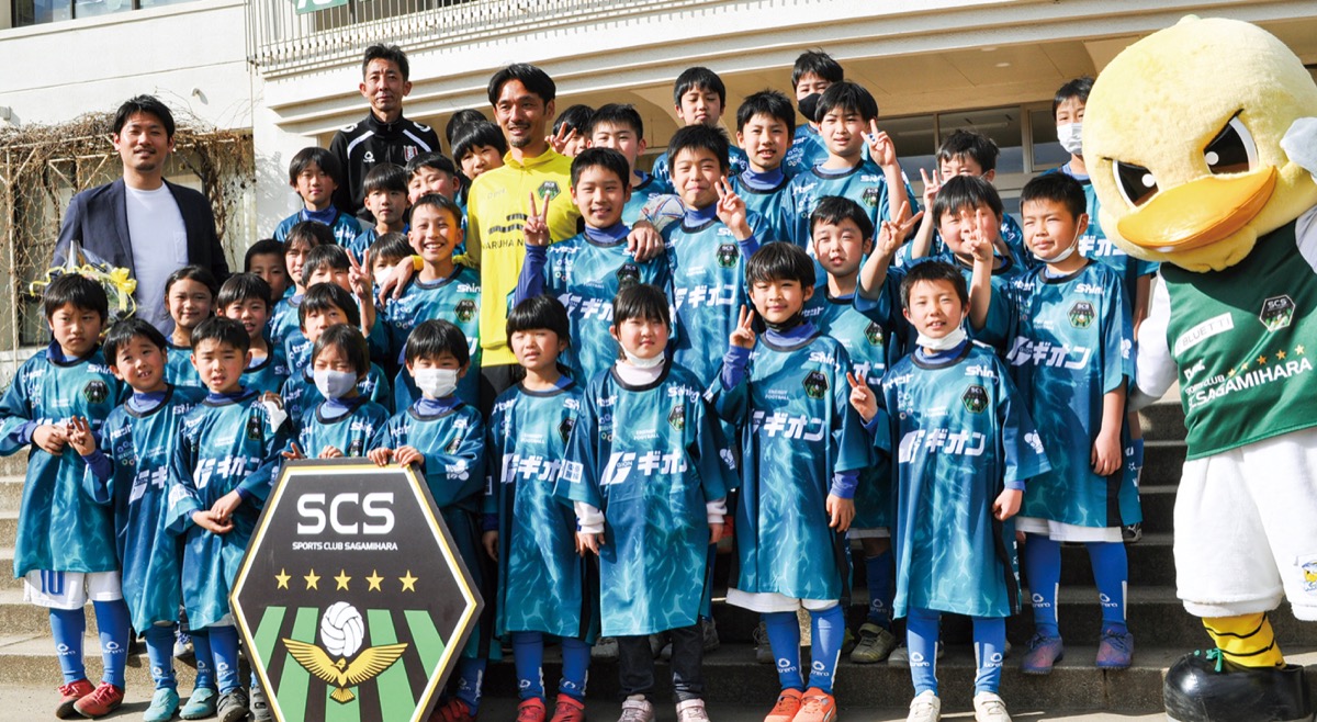 地元サッカークラブJ3「SC相模原」の戸田和幸監督(45)が2月23日、市立淵野辺東小学校(中央区東淵野辺)を訪れ、同校のグラウンドを拠点に活動する少年サッカーチーム東FCの選手にユニフォームを贈呈した。戸田監督は同校の卒業生で、東FC出身。集まった後輩たちに「一緒に頑張ろう」とエールを送った。