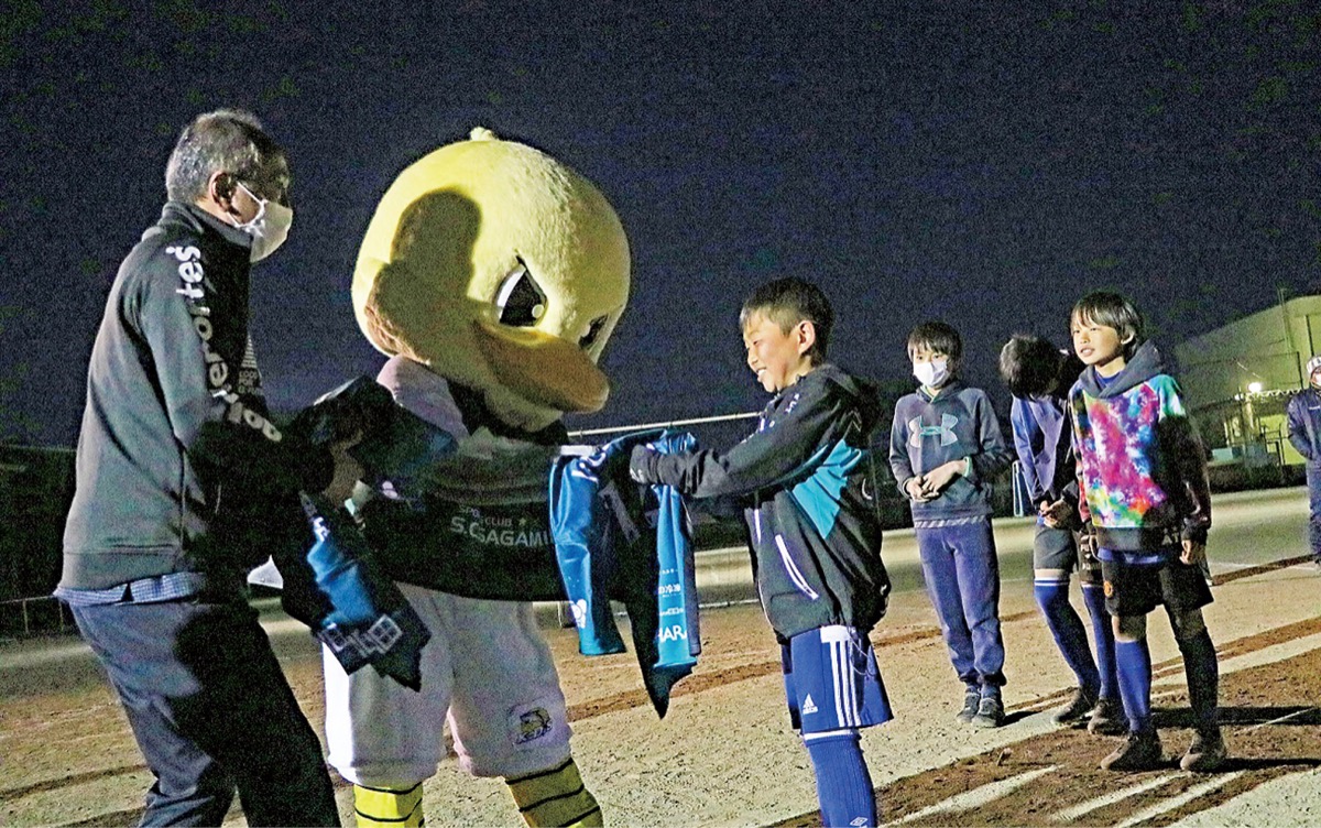 J3・SC相模原は2月21日、愛川町のハリマオサッカークラブ(齋藤増雄代表監督)に所属する80人に、サポーターのために作られたナンバー12が記されたユニフォームをプレゼントした=写真。