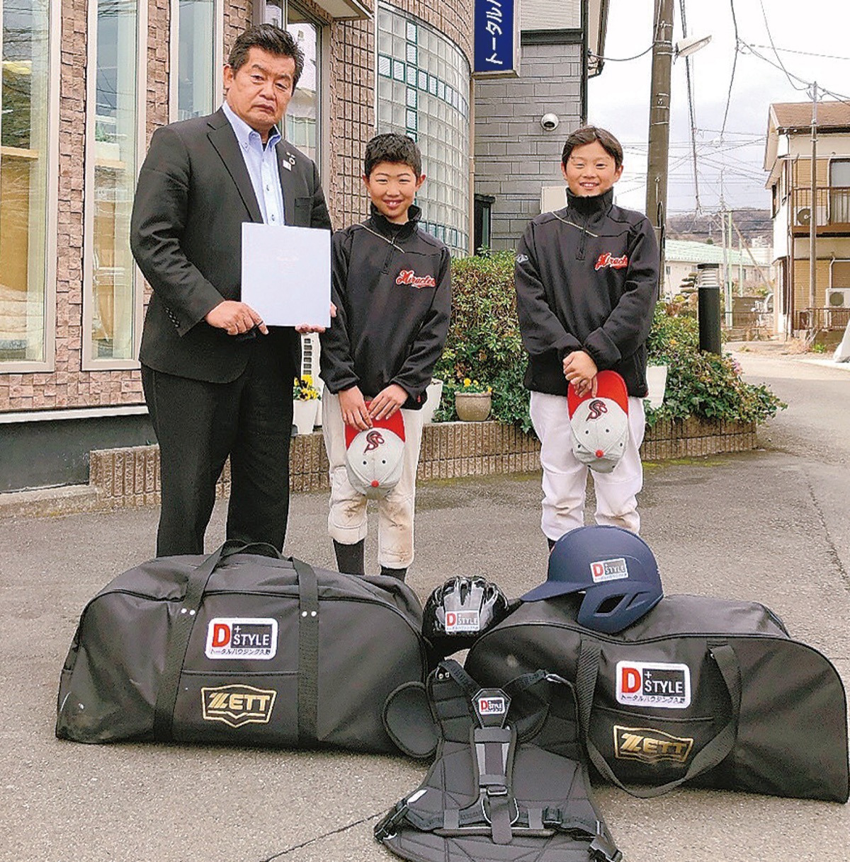 水郷田名出身で同チームの卒業生でもある久野社長が、地元で野球に励む後輩たちを応援したいという思いから、ヘルメット10個、ヘルメットケース2個、キャッチャー防具1セット、バットケース1個、フリース18枚を贈った。
