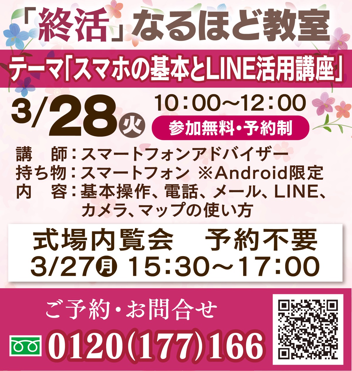 主催は、終活・葬儀についてのセミナー「『終活』なるほど教室」を500回以上開催している創業100年の葬儀社・永田屋。外部からスマートフォンアドバイザーを招き、実際に自分のスマホを使って、楽しく学ぶことができる。同社では「スマホの活用により、ご家族・友人との絆が深まることで、より良い人生にしていただきたいという想いで本講座を開催しています」と話す。当日は式場内覧、個別相談も可能。27日(月)は予約不要の式場内覧会も開催。