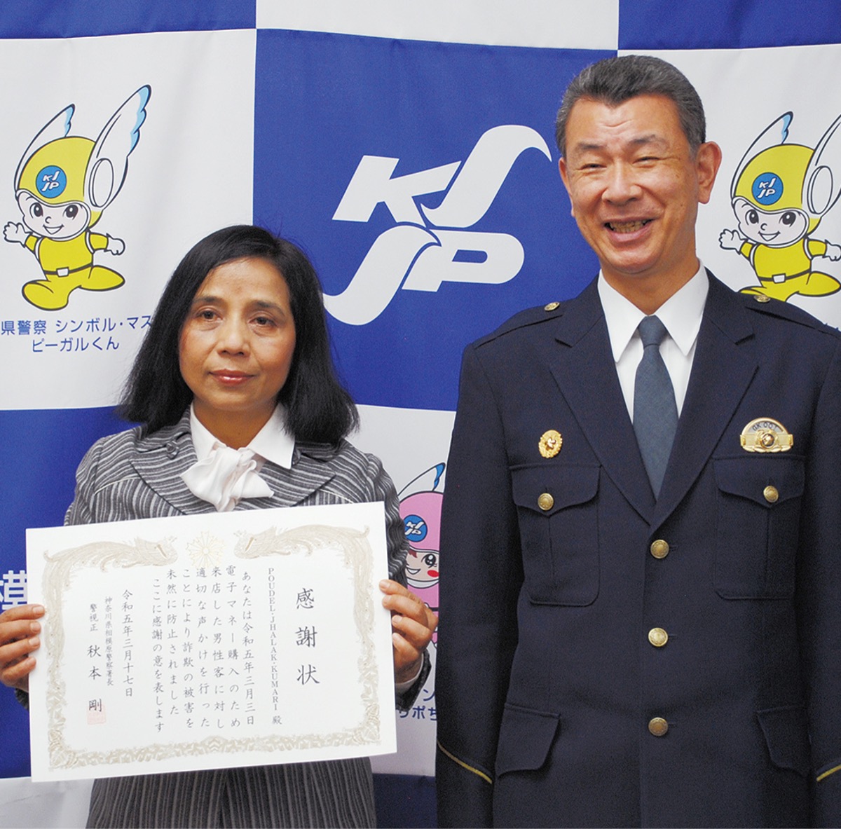 特殊詐欺の被害を未然に防いだとして相模原警察署(秋本剛署長)は3月17日、中央区内のコンビニ店員でネパール人のポーデル・ジャラク・クマリさんに感謝状を贈呈した。