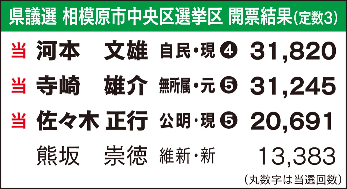 定数3に対し、現職2人、元職1人、新人1人の計4人が立候補した中央区の県議選は、自民党の河本文雄氏(66)がトップ当選した。現職、元職合わせ、前回無投票当選した3人が議席を確保した。